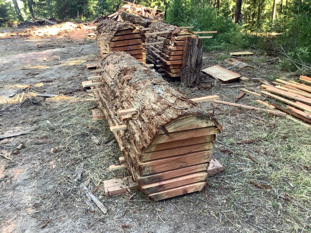 From the mossy forest floor, these logs are tenderly lifted, their uniqueness preserved with utmost care. Despite their weight, often exceeding 3,000 pounds, they are handled with a gentleness born of deep respect. The journey from forest to workshop is a testament to both patience and perseverance, as the craftsmen navigate challenging terrain with a commitment to minimizing their impact on the land. Utilizing teams of men and specialized rubber track vehicles, they tread lightly, leaving the natural world undisturbed as they bring these majestic logs into the light. Often, months pass as they wait for the roads to dry and become passable, a testament to their unwavering dedication to their craft and the preservation of nature’s beauty.