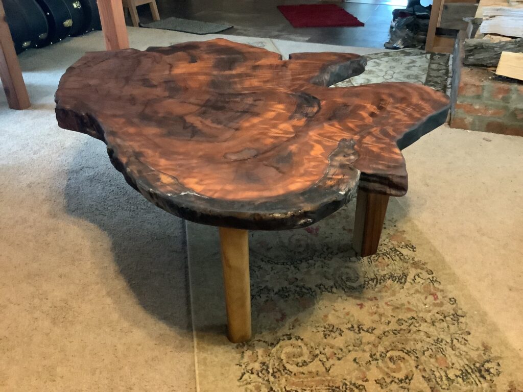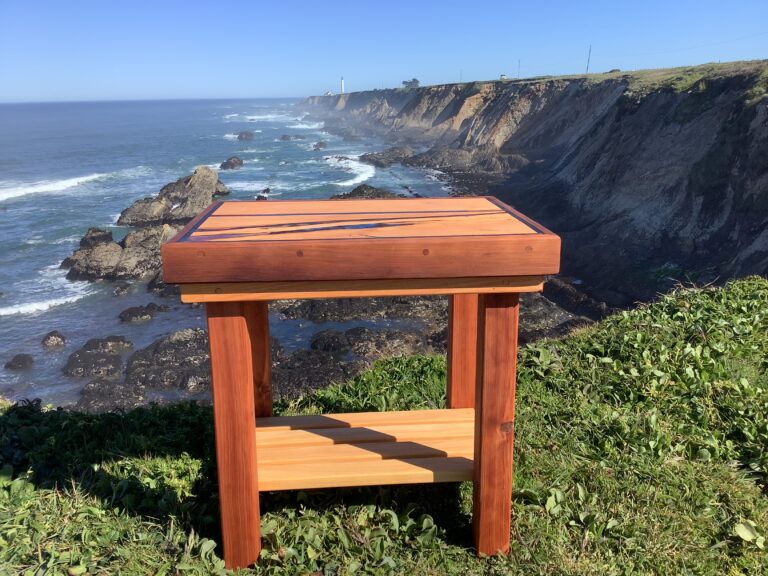 Nestled in the corner of an artisan’s workshop lies a truly unique piece of craftsmanship—a handmade end table that stands as a testament to the artistry and dedication of its creator. This one-of-a-kind table is a harmonious blend of cypress and redwood, both trees native to the majestic northern California coast. The materials, salvaged rather than left to rot, have been given a new life, transformed into a work of art that radiates both beauty and history.